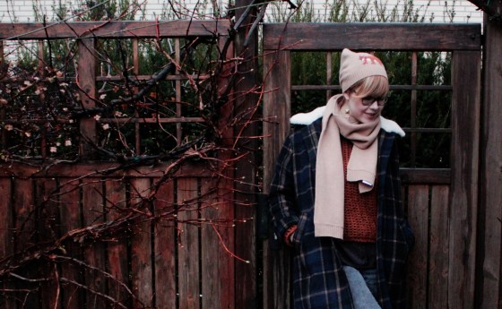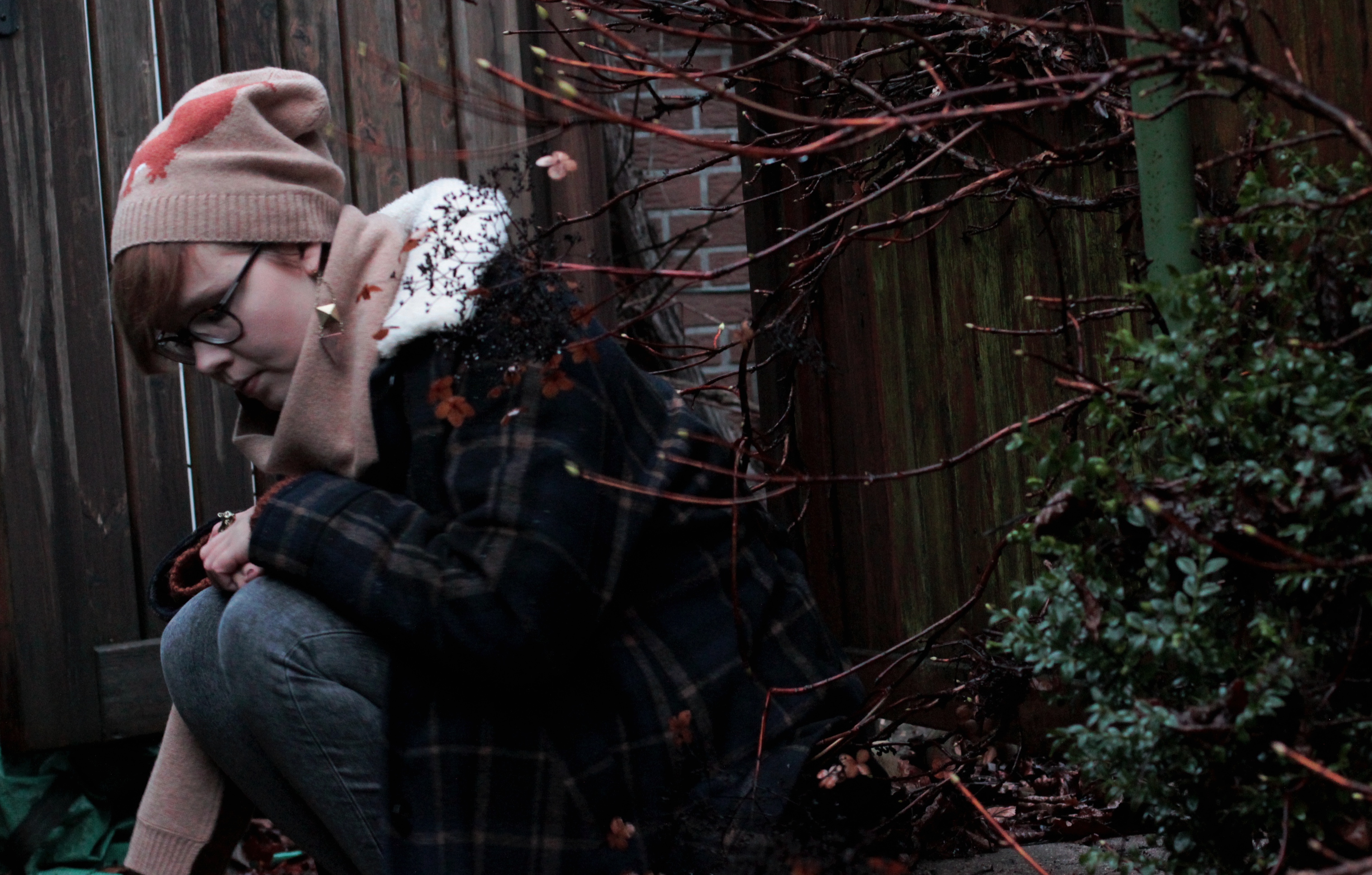 Mantel – Urban Outfitters , Mütze – Marie Lund , Schal – Marie Lund , Ring – Pretty Sucks , Schuhe – ähnliche hier oder hier , Hose – Monki