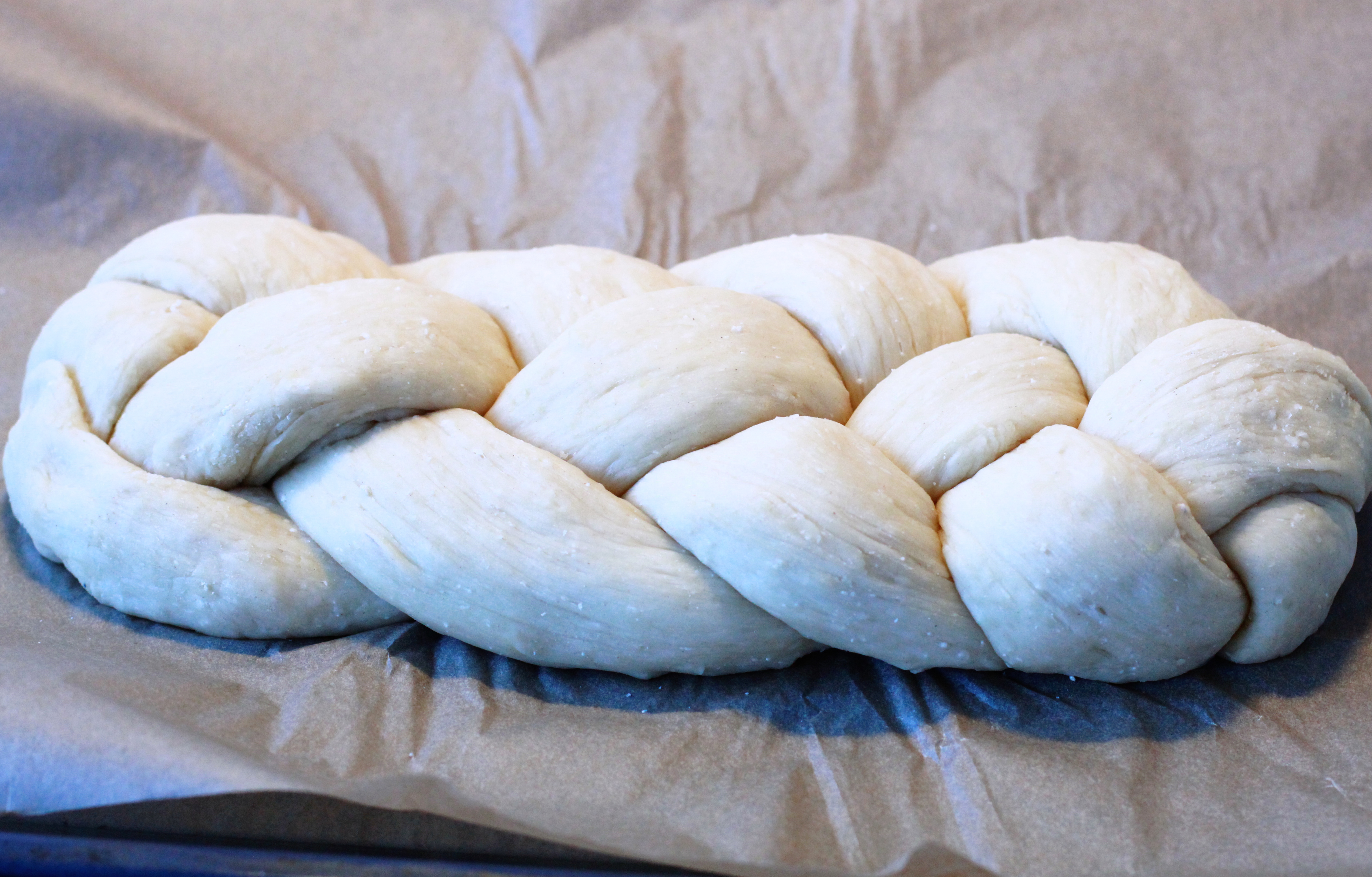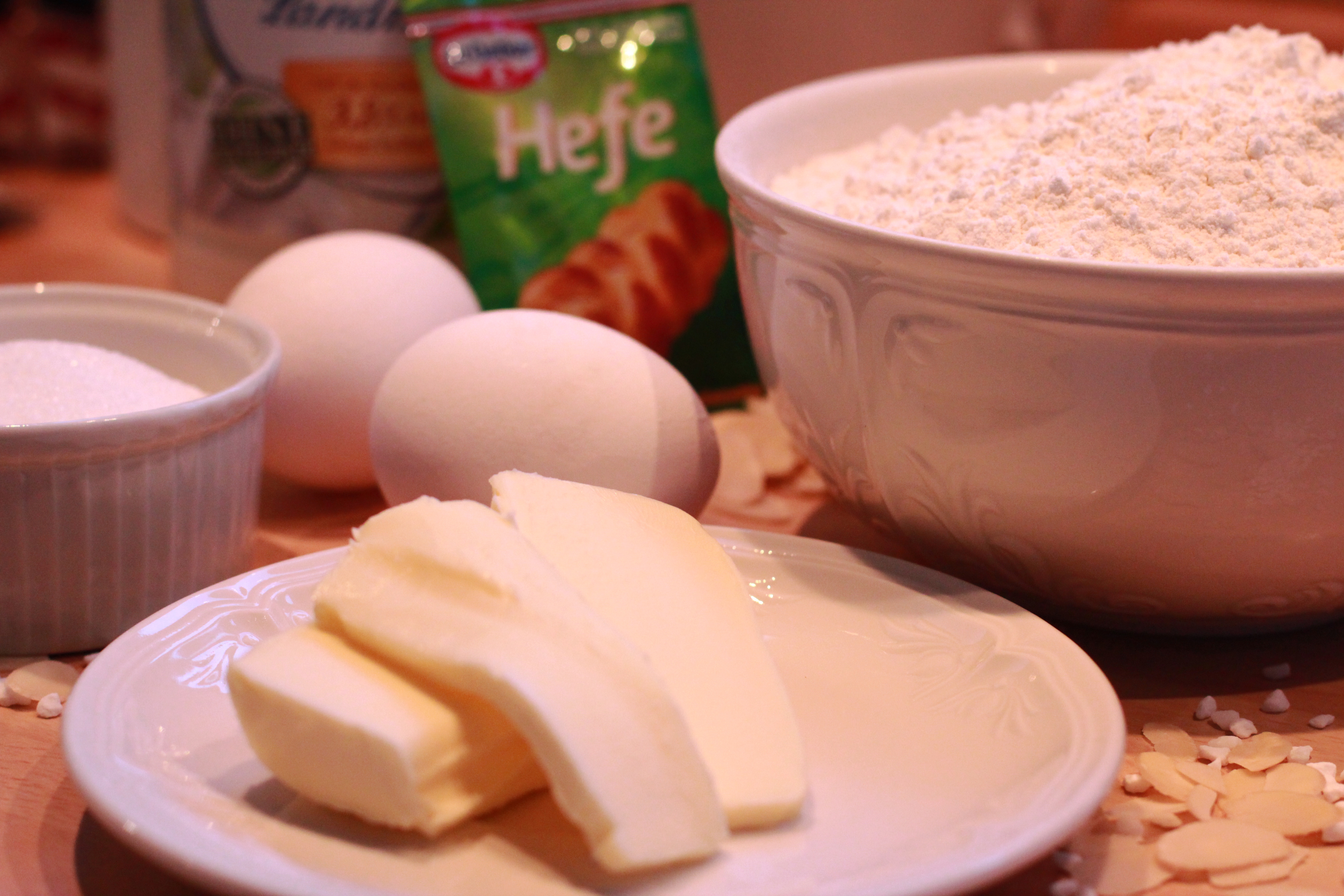 Wenn sich der Teig merklich vergrößert hat, ihn in 4 Stränge unterteilen und zu einem Zock fleckten. Dazu immer den Strang ganz rechts außen abwechselnd über und unter die anderen Stränge führen. Den geflochtenen Zopf nochmals 15 Minuten ruhen lassen. Danach mit den restlichen Eigelben einstreichen, damit die Oberfläche von dem Zopf später einen schönen Glanz bekommt. Den Hagelzucker und die Mandelsplitter drüber streuen. Bei 175°C den Hefezopf ca. 20 Minuten backen lassen, bis er eine goldbraune Farbe hat. Abkühlen lassen und fertig. Vorzugsweise am selben Tag essen, da Hefeteig frisch einfach am besten schmeckt.