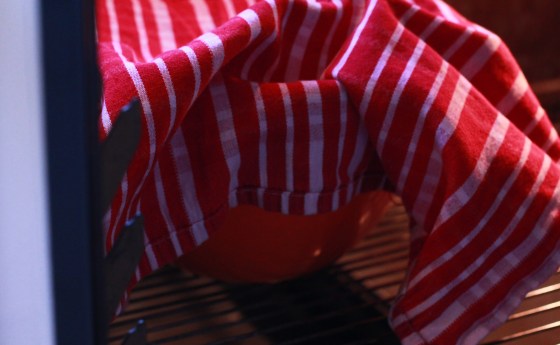 Die Zutaten für den Teig vermengen. Wichtig ist, dass nichts Kaltes in den Teig kommt, da sonst die Hefe nicht richtig aufgeht. Sowohl Milch als auch die Butter erwärme ich deshalb in der Mikrowelle, bevor ich sie in den Teig gebe. Nachdem der Teig fertig ist, ein sauberes Geschirrtuch über die Schüssel legen und ihn ca. eine halbe Stunde an einem warmen Ort, beispielsweise auf der Heizung, ruhen lassen. Ich stelle Hefeteig meistens bei 50°C in den Backofen. So kann ich sicher sein, dass er es warm genug hat.