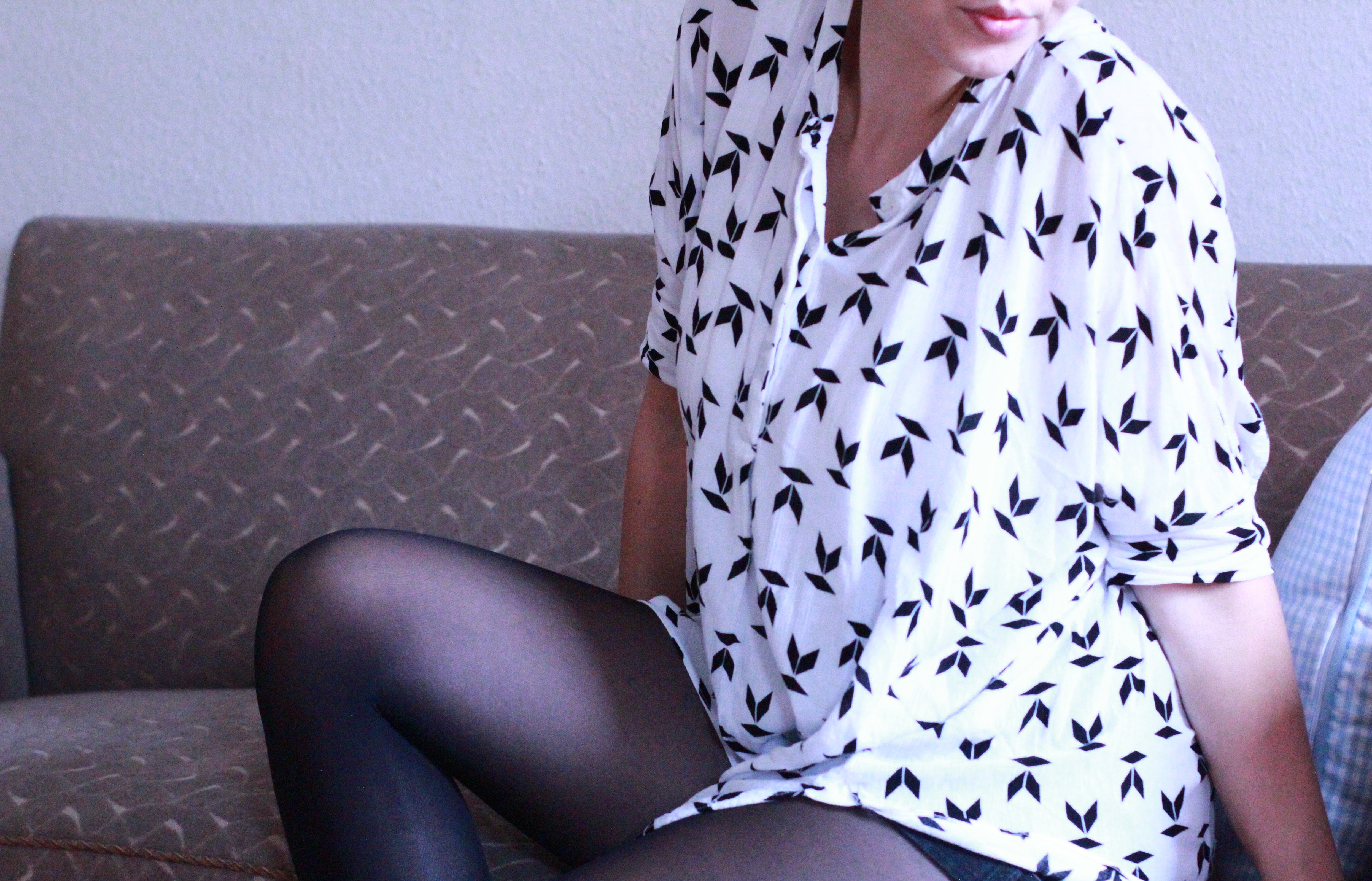 Im Zentrum steht eine weiße oversized Bluse mit grafischem Muster, das mich irgendwie an Origami erinnert hat. Was wahrscheinlich auch der Grund war, weshalb ich sie mitgenommen habe. Diese Bluse ist besonders an heißen Tagen sehr angenehm zu tragen und man ist trotzdem gut angezogen, wie ich finde. Dazu habe ich einfach eine schwarze Shorts mit einer Strumpfhose kombiniert. Ein lässiges, schlichtes Outfit um entspannt in der Stadt shoppen zu gehen. Was meint ihr?