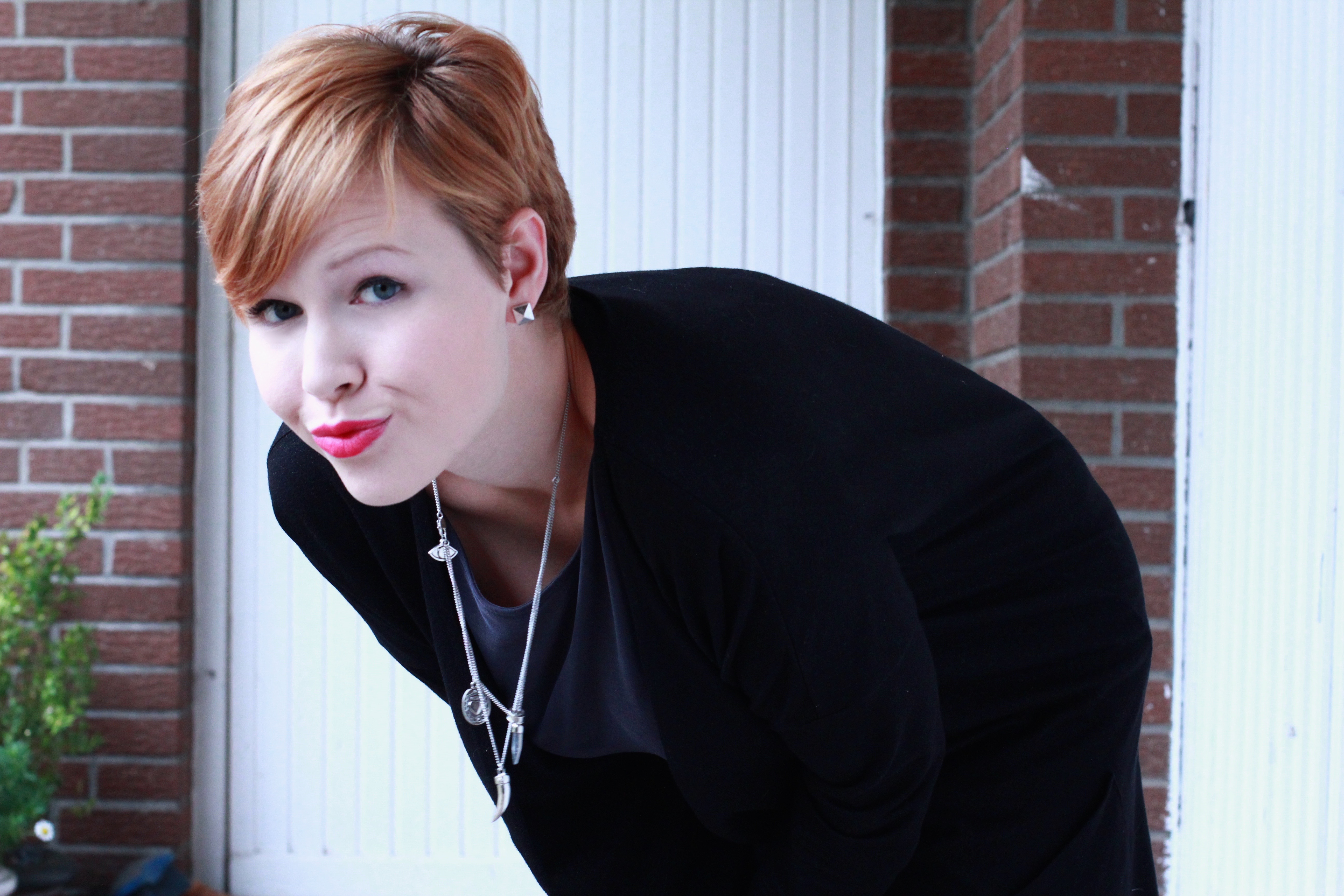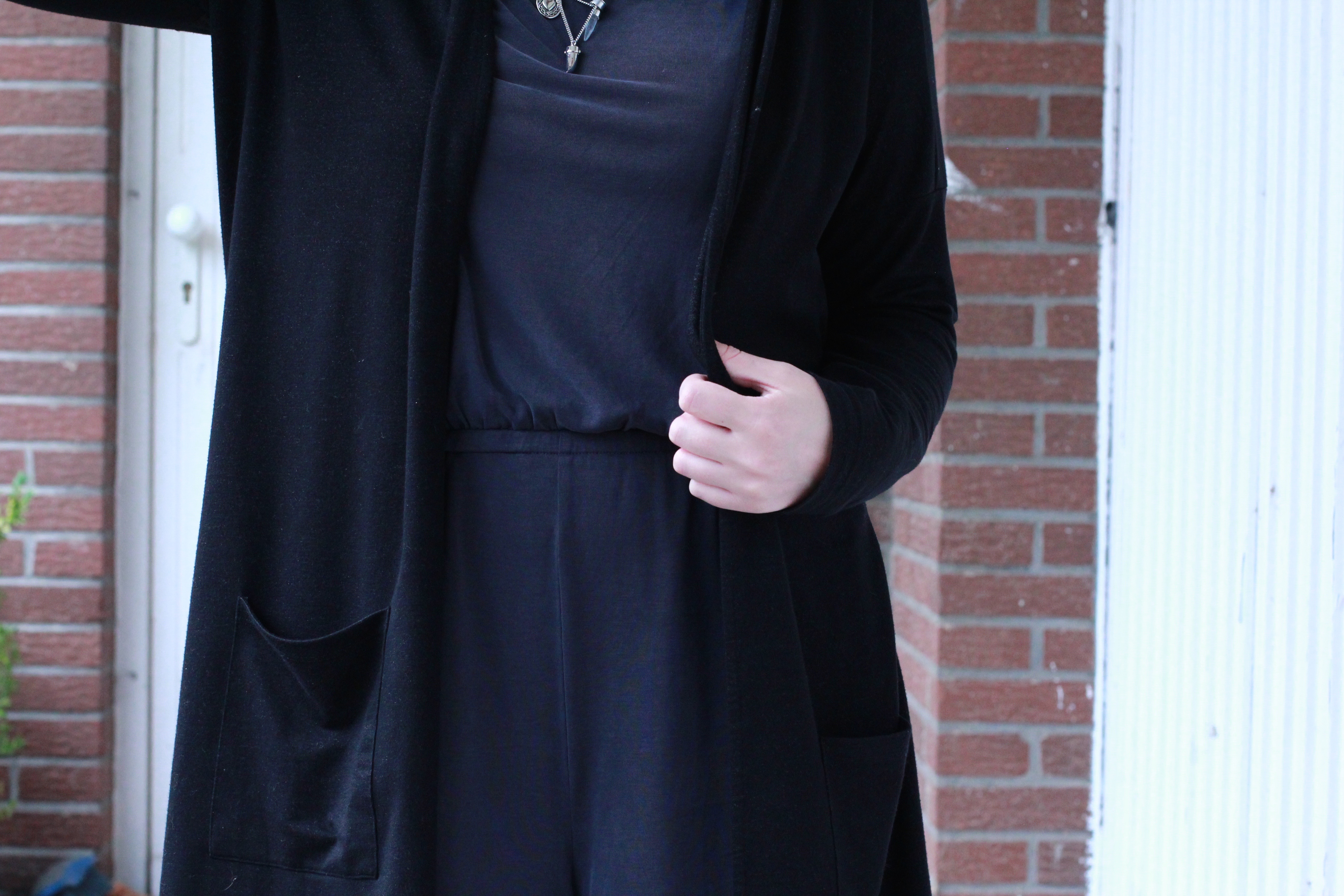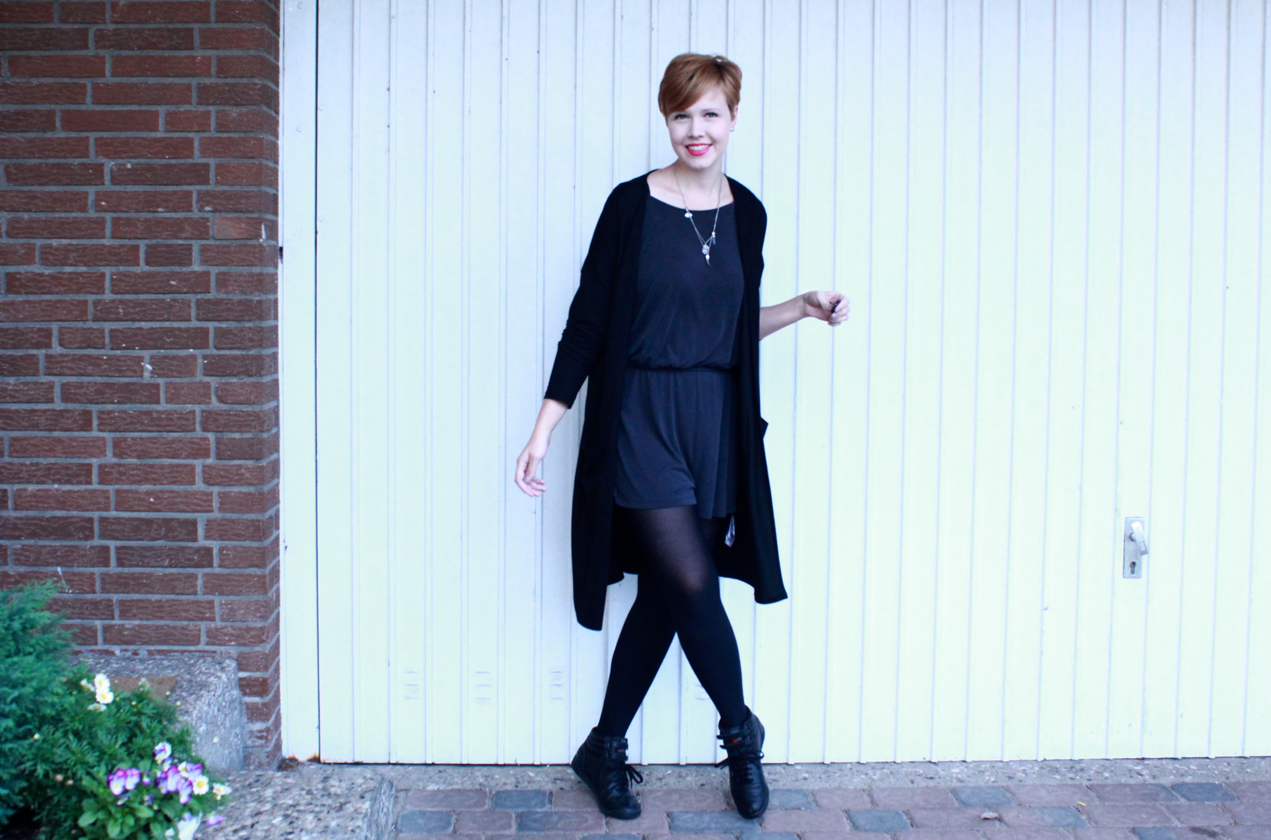 Wie nach meiner Ankündigung nicht anders zu erwarten, ist es überwiegend schwarz. Im Zentrum des Looks steht ein blau-grauer Jumpsuit, den ich in den letzten paar Monaten ständig getragen habe. Ein echtes Lieblingsstück. Um das Outfit etwas vollständiger aussehen zu lassen, habe ich mir einen Long Cardigan übergezogen, eine schwarze Strumpfhose darf hierbei natürlich nicht fehlen. Meine absoluten Favoriten in Sachen Strumpfhosen sind die blickdichten von Tchibo, mit denen ich mich regelmäßig eindecke. Für einen etwas sportlichen Touch sorgen meine heißbeliebten Reeboks. Etwas linken Lippenstift als kleinen Farbakzent und Voilà, fertig bin ich für die ersten Herbsttage. Was meint ihr?