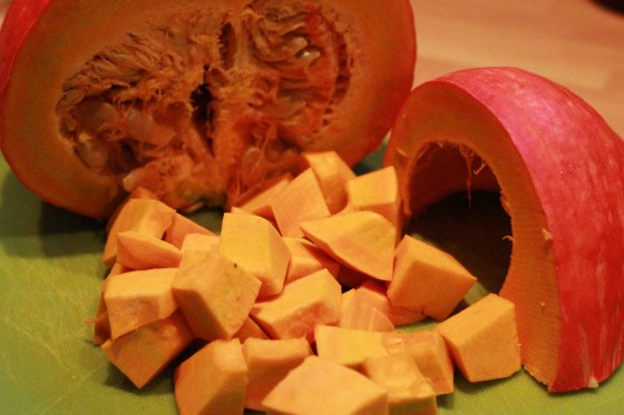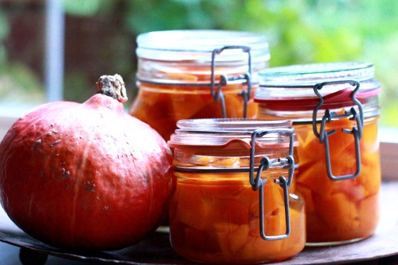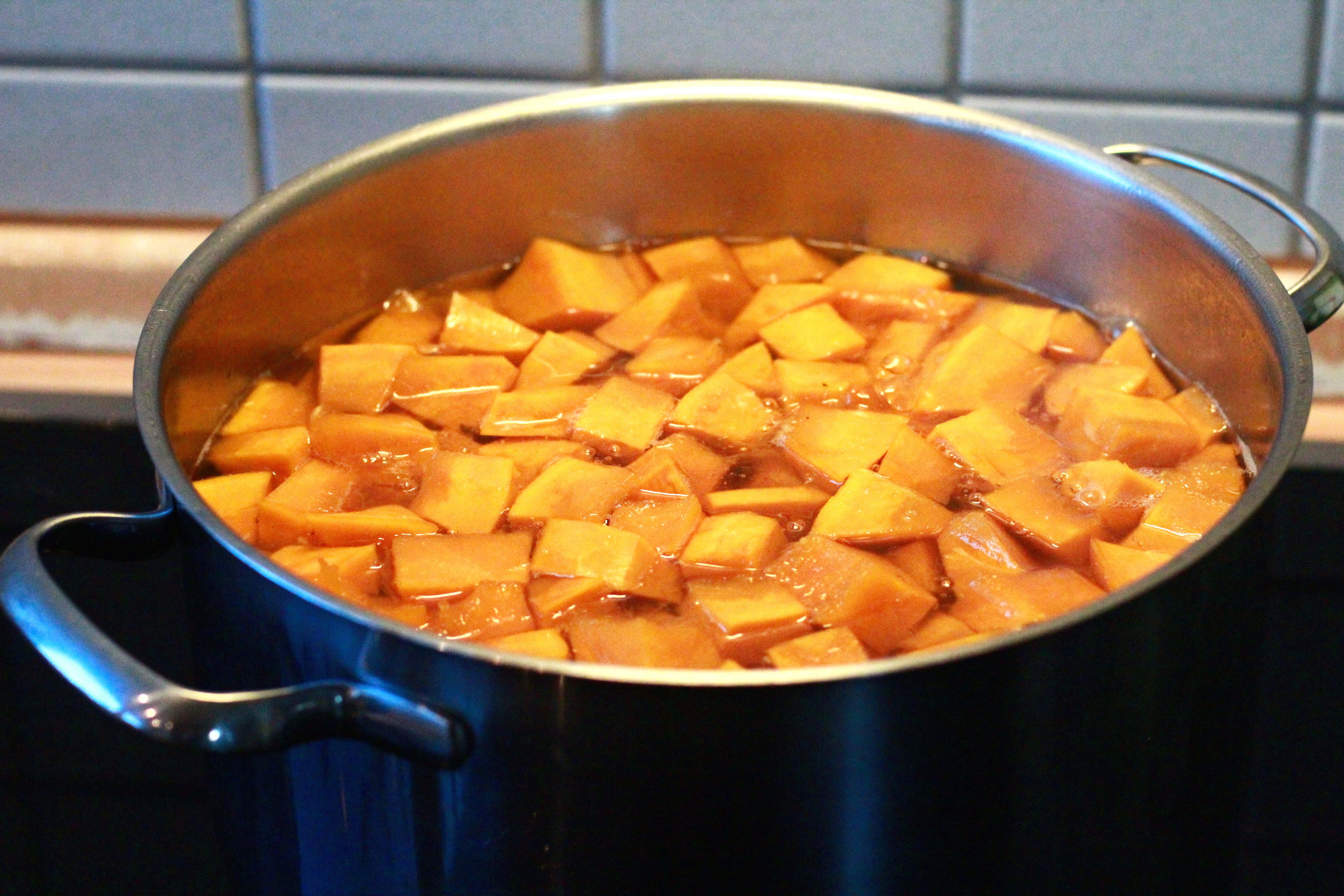 Zunächst stelle ich die Einmachgläser bei 180°C in den Backofen. Dies dient dazu die Gläser zu desinfizieren und sie vor dem Zerspringen zu schützen, wenn der heiße Kürbis eingefüllt wird. Dementsprechend darf der Ofen auch nicht vorgeheizt werden, damit die Gläser langsam erhitzt werden. Sobald die Gläser im Ofen sind, bereite ich den Kürbis vor. Zunächst wird er halbiert und ausgehöhlt. Danach schneide ich ihn in Streifen und schäle diese. Wie ich schon bei meiner Kürbissuppe erwähnt habe, brauch man einen Hokkaido eigentlich nicht zu schälen. In diesem Fall ziehe ich es jedoch vor, da so der Kürbis die Flüssigkeit von allen Seiten aufnehmen kann. Als nächstens schneide ich die Streifen zu Würfeln. Dann bringe ich das Wasser mit dem Essig, dem Zucker und den Gewürzen zum Kochen. Wenn das Wasser kocht, gebe ich die Kürbiswürfel hinzu. Das ganze lasse ich auf kleiner Stufe vor sich hin köcheln bit der Kürbis durch und leicht glasig geworden ist. Als letztes fülle ich den Kürbis in die heißen Einmachgläser. Hierbei ist zu beachten, dass die Kürbisstückchen komplett mit Flüssigkeit überdeckt sein müssen. Eine schöne Möglichkeit um Kürbis zu konservieren, ihn später in super Form weiterzuverwenden oder einfach so zu naschen.