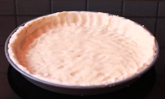 Zunächst eine Quicheform fetten und den Ofen auf 230°C vorheizen. Dann alle oben aufgelisteten Zutaten in eine Schüssel geben und zu einem Mürbeteig verarbeiten. Ist alles gut vermengt, den Teig auf der mit Mehl betreuten Arbeitsplatte gleichmäßig ausgerollen. Ist der Teig breit genug ausgerollt und ordentlich bemehlt, kann er auf einem Nudelholz aufgerollt und über die Quicheform wieder abgerollt werden. Sollte das, wie in meinem Fall nicht gelingen, kann die Form auch per Hand mit dem Teig ausgelegt werden.